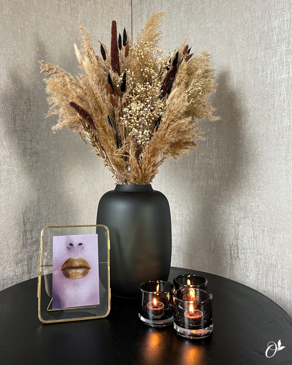 Dit prachtige droogboeket is voorzien diverse bruin tinten, dit boeket zal door de natuurtinten in vele interieurs zal staan. Door de mooie pluimen in combinatie met de mooie bruin tinten geeft dit een warm en romantisch effect aan het boeket. In dit boeket zitten onder andere de volgende bloem- & graansoorten; Lagurus, Gipskruid en Pampas.